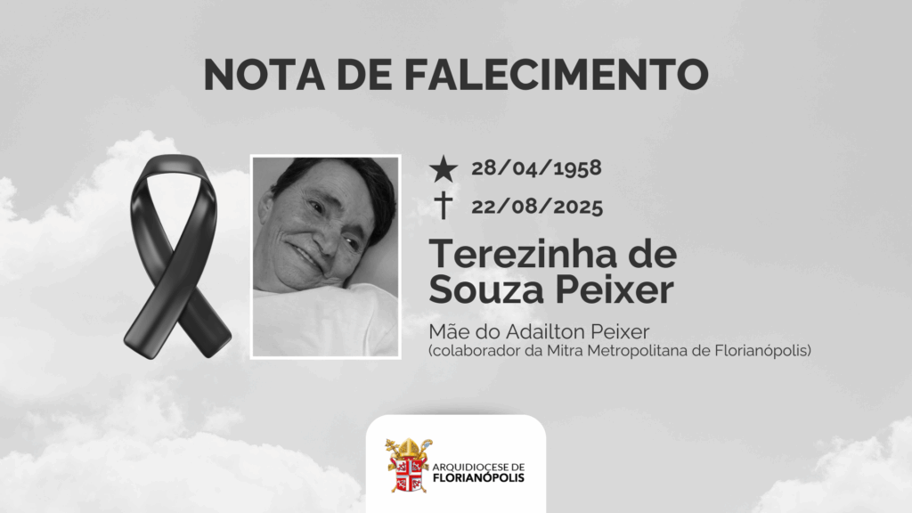 Com pesar, a Arquidiocese de Florianópolis comunica o falecimento da Sra. Terezinha de Souza Peixer, mãe de Adailton Peixer, nosso colaborador, que faleceu na noite desta sexta-feira, 22 de agosto. A celebração de exéquias será às 15h e o sepultamento às 16h, no cemitério de Barreiros. Elevemos nossas orações a Deus pelo descanso eterno da […]