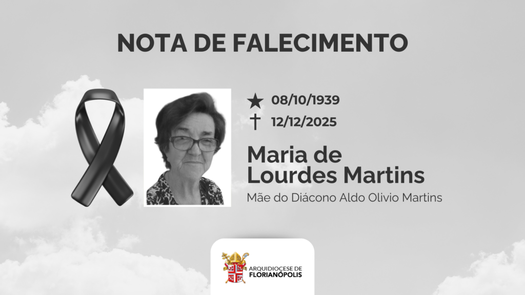 Com pesar, a Arquidiocese de Florianópolis comunica o falecimento da Sra. Maria de Lourdes Martins, mãe do Diác. Aldo Olívio Martins aos 86 anos, nesta sexta-feira. A celebração de exéquias será hoje às 15h, no Cemitério Municipal de Barreiros, em São José. A Arquidiocese, na esperança da vida eterna, reza pelo descanso de sua alma […]