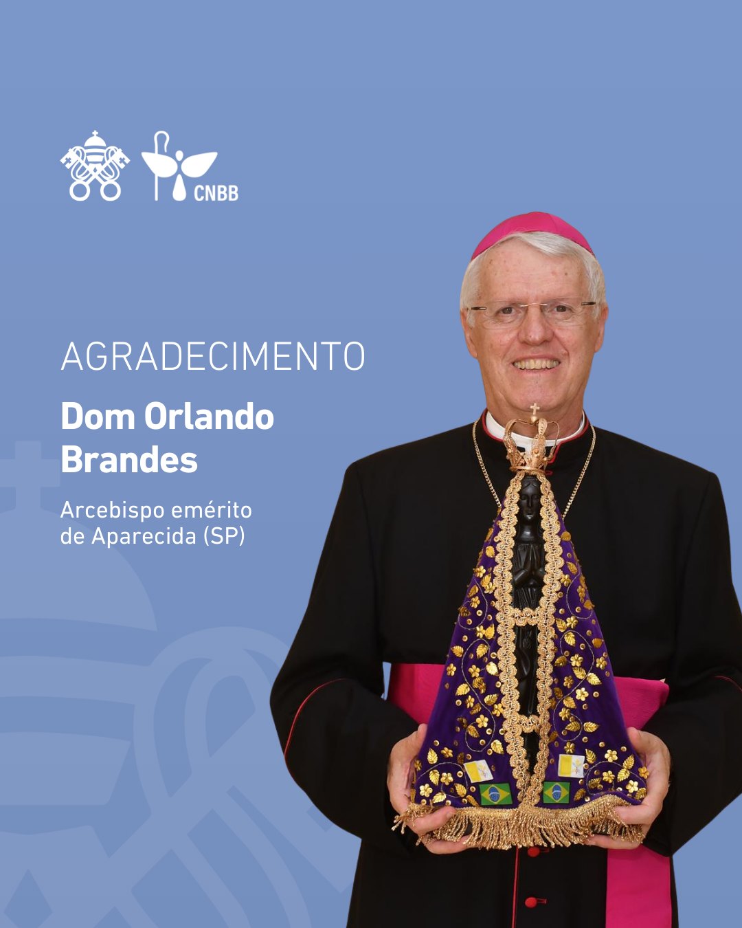 A Conferência Nacional dos Bispos do Brasil manifesta sua profunda gratidão ao senhor pelo generoso e fecundo serviço pastoral à frente da Arquidiocese de Aparecida.