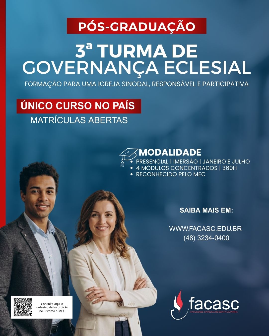 A Faculdade Católica de Santa Catarina (FACASC) apresenta a 3ª turma da Pós-Graduação em Governança Eclesial, um curso que responde aos desafios contemporâneos da missão evangelizadora, promovendo uma cultura de corresponsabilidade, transparência e participação.