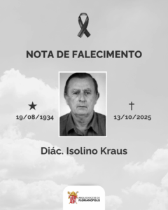 Comunicamos com pesar o falecimento nesta segunda-feira, dia 13 de outubro de 2025, o Diácono Isolino Kraus, aos 92 anos. Ele exercia seu ministério na Paróquia Santo Amaro, no bairro Loeffelscheidt, na cidade Águas Mornas.