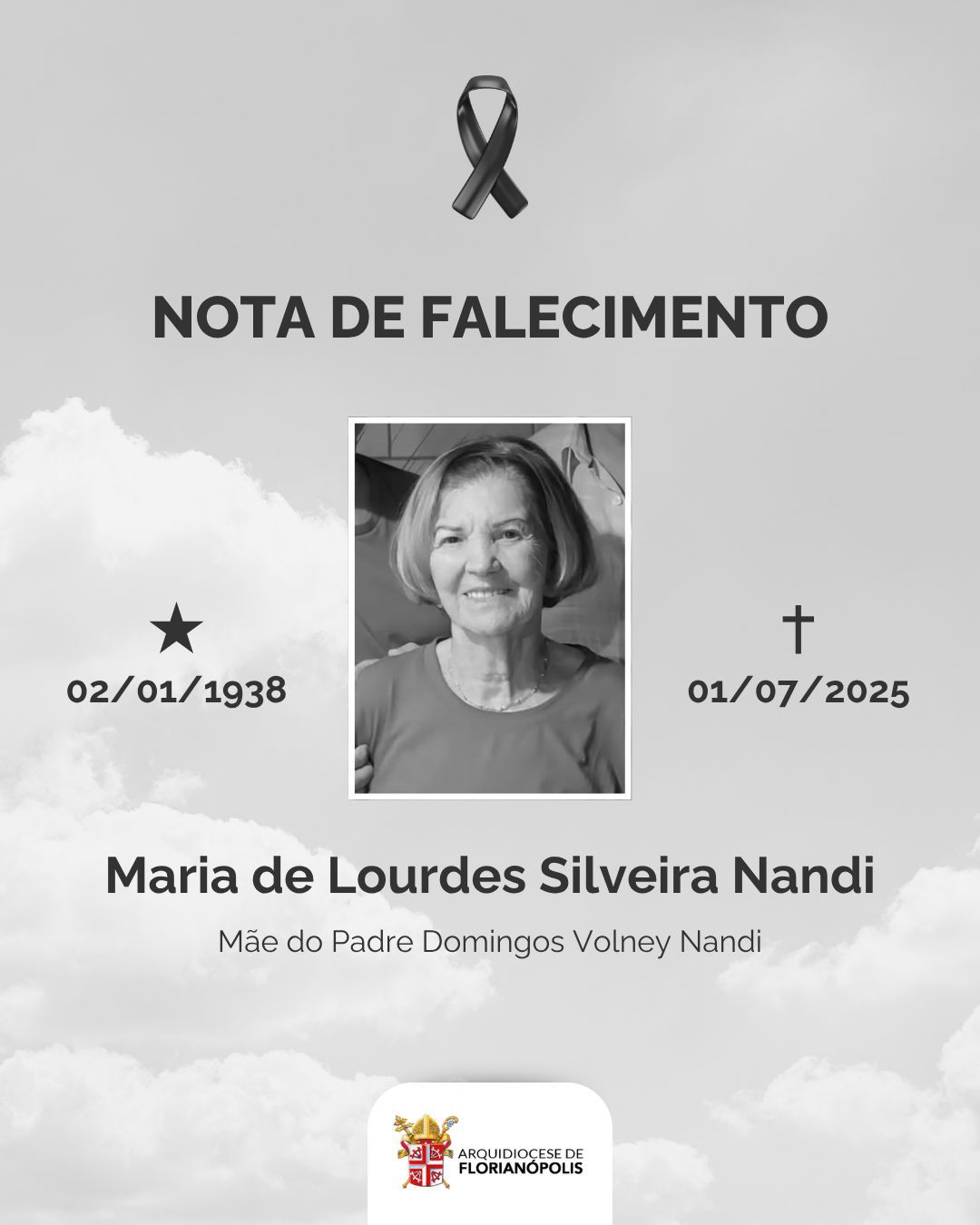 Neste momento de dor e saudade, a Arquidiocese une-se em oração ao Pe. Nandi, seus familiares e amigos, rogando a Deus pelo eterno descanso de Maria de Lourdes e pelo conforto dos corações enlutados.