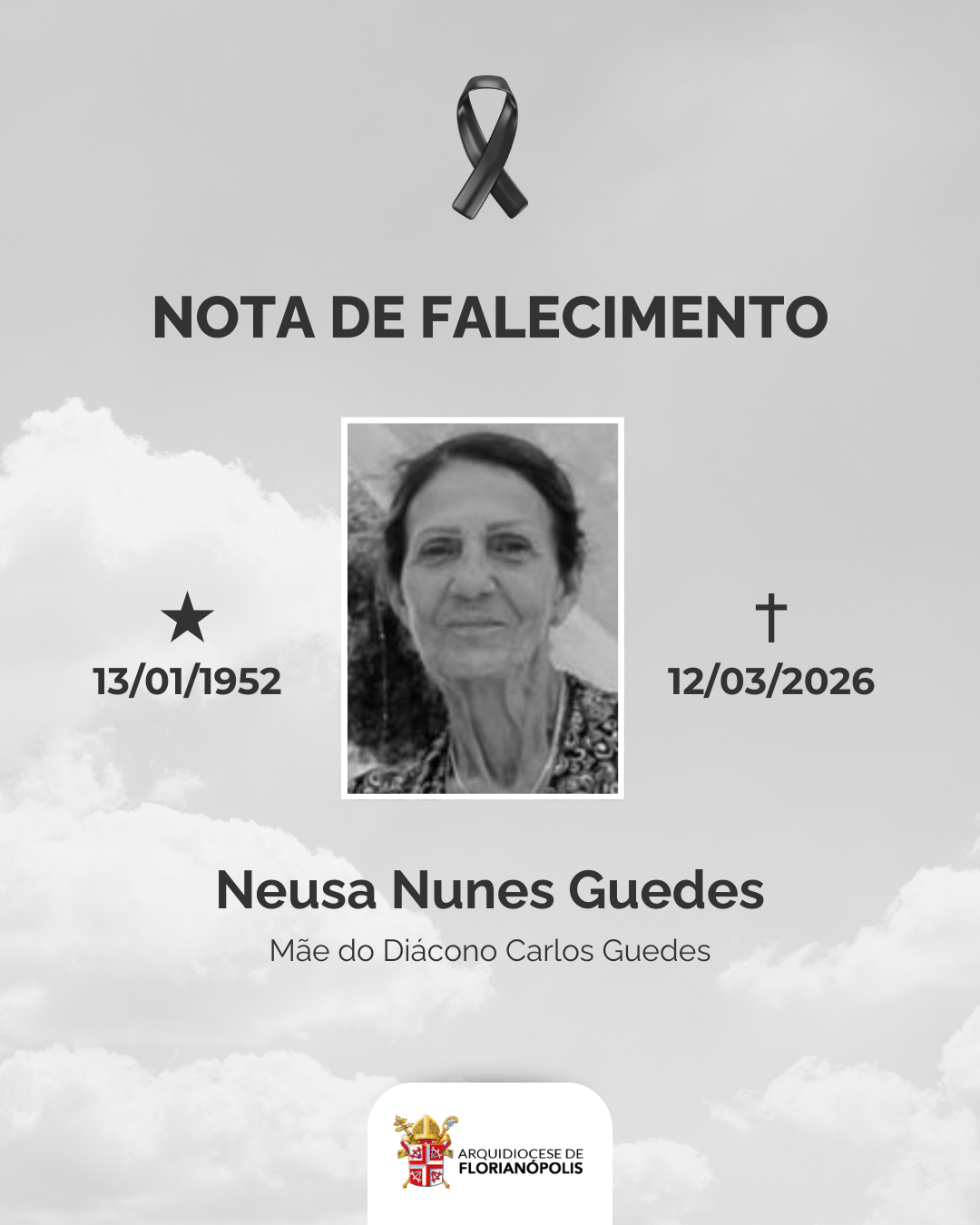 Com pesar, a Arquidiocese de Florianópolis comunica o falecimento da Sra. Neusa Nunes Guedes, mãe do Diác. Carlos Guedes, nesta quinta-feira (12/03), aos 74 anos.